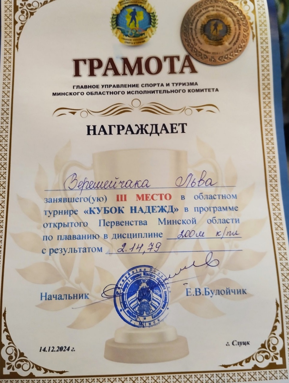 14 декабря в г.Слуцк проходил областной турнир "Кубок надежд" в программе открытого Первенства Минской области по плаванию. Участники соревновались на дистанции 200м комплексное плавание. Из команды ГУ "СДЮШОР СОЛИГОРСКОГО РАЙОНА" 3 место занял - Веремейчик Лев, тренер-преподаватель Коваленко Анжела Викентьевна.