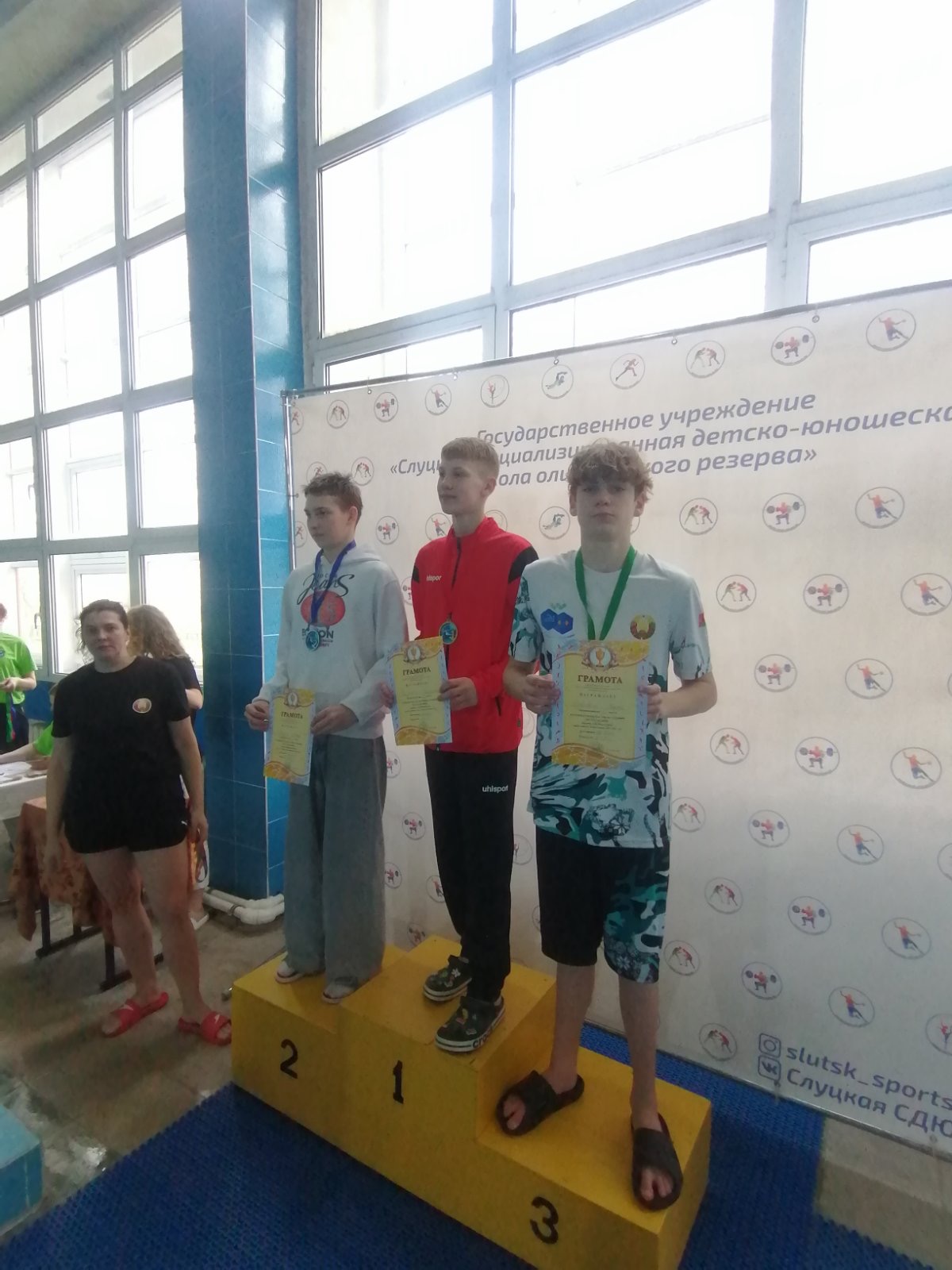 3 место на дистанции 100м батт заняла - Зотова Маргарита, на этой же дистанции 3 место занял - Клишевич Клим.