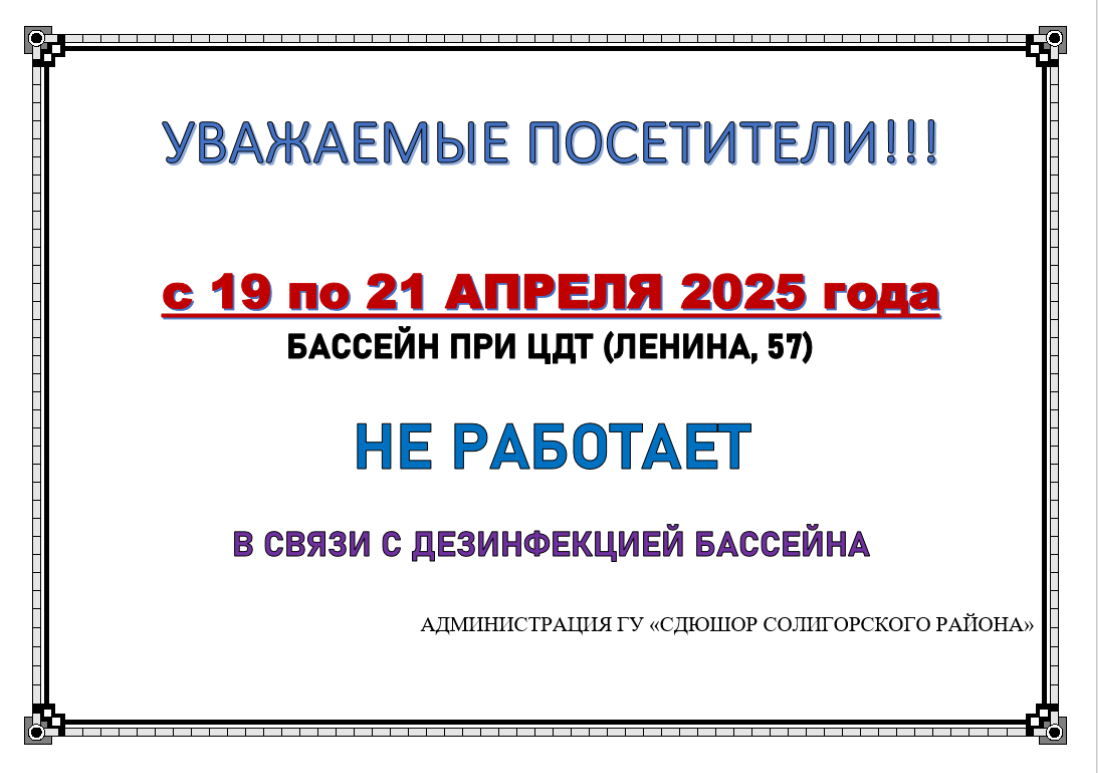 Бассейн при "ЦДТ" с 19 по 21 апреля не работает!
