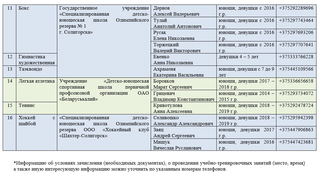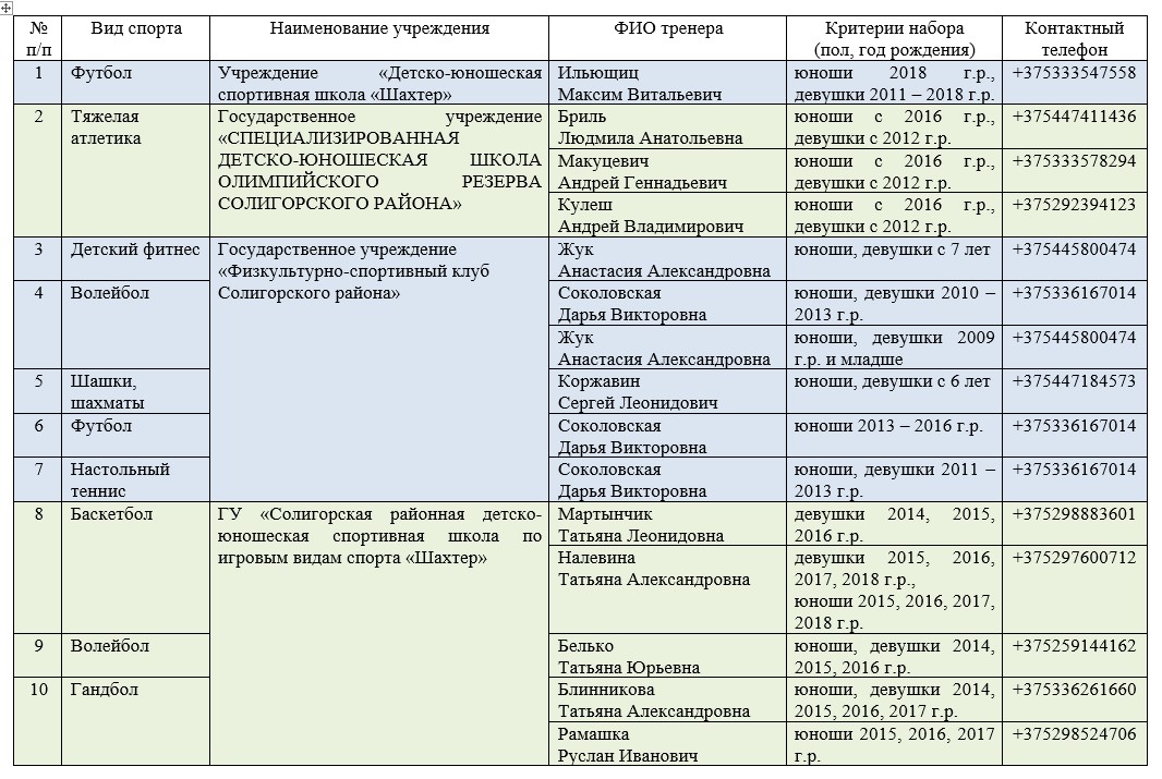 Информация о наборе детей в группы по видам спорта в учреждениях физической культуры и спорта Солигорского района в 2025/2026 учебном году.