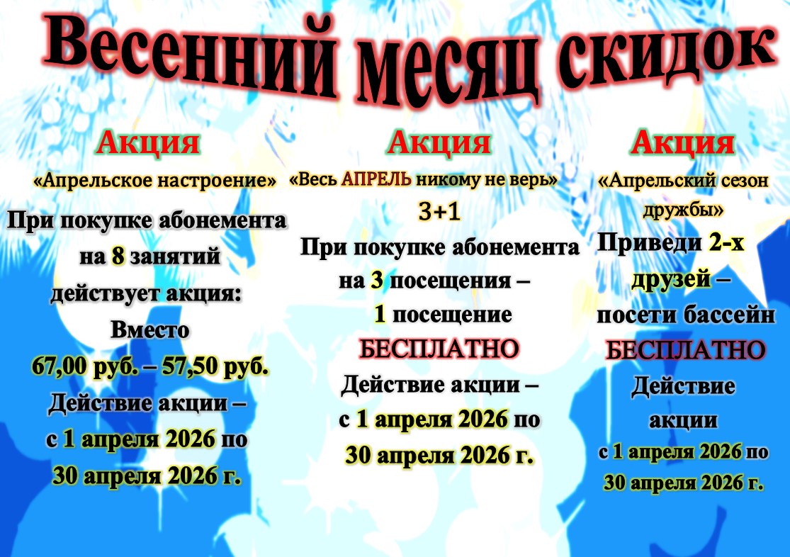 Приглашаем всех жителей г.Солигорска и Солигорского района посетить бассейн в апрельский сезон скидок! Подробную информацию уточняйте по номеру телефона: 32 09 27