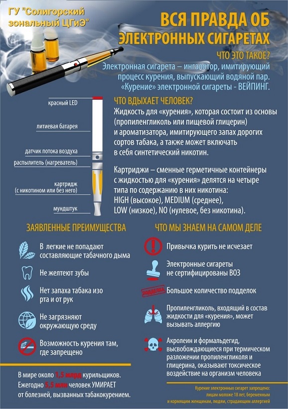 Пропиленгликоль используется в бытовой химии, а его регулярное употребление может привести к появлению аллергических реакций, хроническим заболеваниям легких и утрате обоняния. Не менее вреден и глицерин, испаряющийся в электронных сигаретах. Вдыхая его пары, человек может испытывать сухость во рту, кашель, столкнуться с воспалительным процессом в горле и легких.